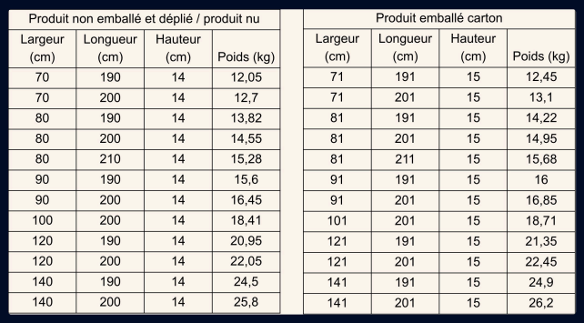 Tailles emballés et non emballés
